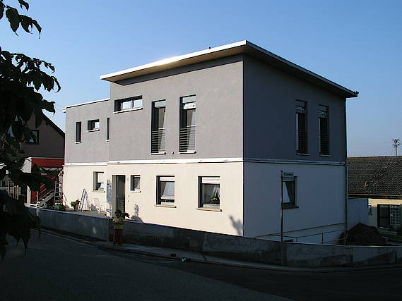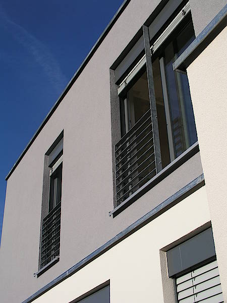 So wurde kurzerhand auf ein bestehendes eingeschossiges, teilunterkellertes Gebäude mit einem unausgebauten, flach geneigten Satteldach aufgebaut. Wie? Das Dachgeschoss wurde entfernt und die bestehende Decke über dem Erdgeschoss statisch it Spannbetondecken verstärkt. So war es möglich, eine Aufstockung in höchst modernem Stil zu verwirklichen. Zusätzlichen Lagerraum schufen wir im Außenbereich des Obergeschosses. Hier entstand ein separater Speicher.